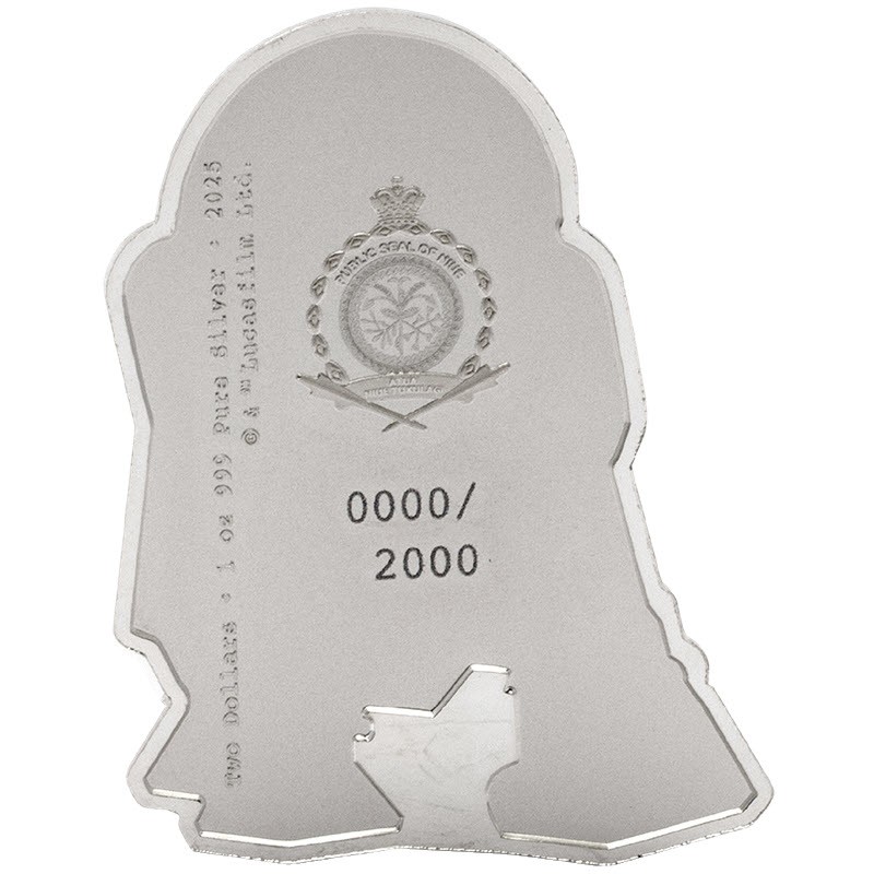 На аверсе изображен герб Ниуэ. Слева надпись: Two Dollars · 1 oz 999 Pure Silver · 2025 © & ™ Lucasfilm Ltd. (номинал, вес и проба серебра, год чеканки, авторские права). Под гербом: хххх/2000 (индивидуальный номер монеты).