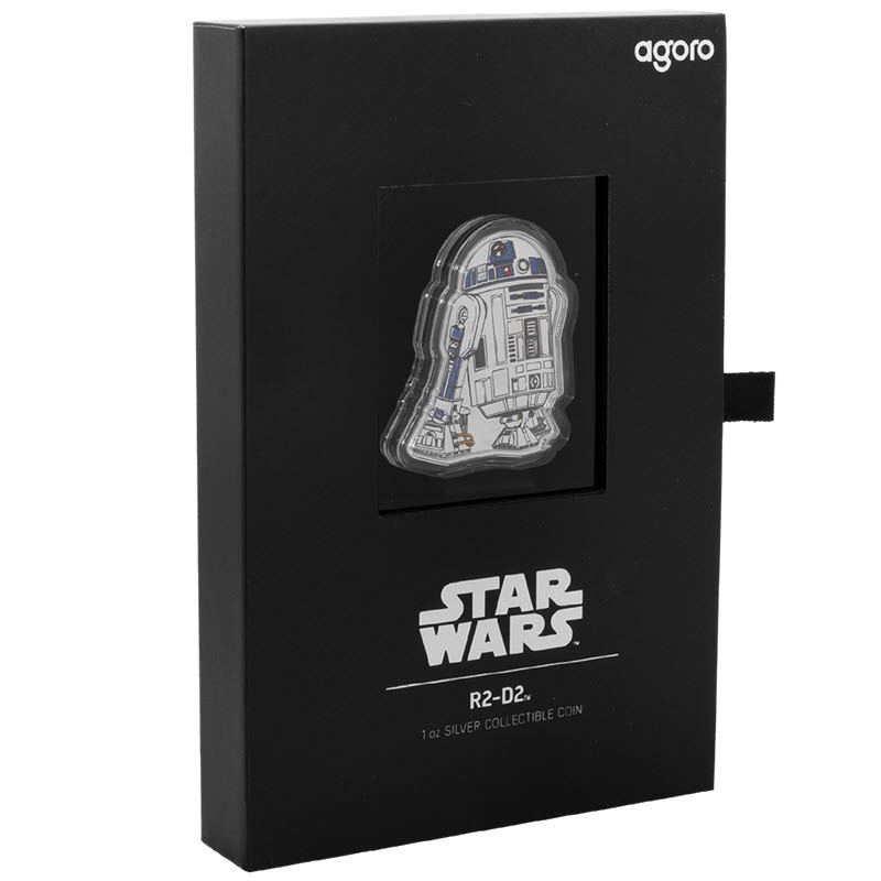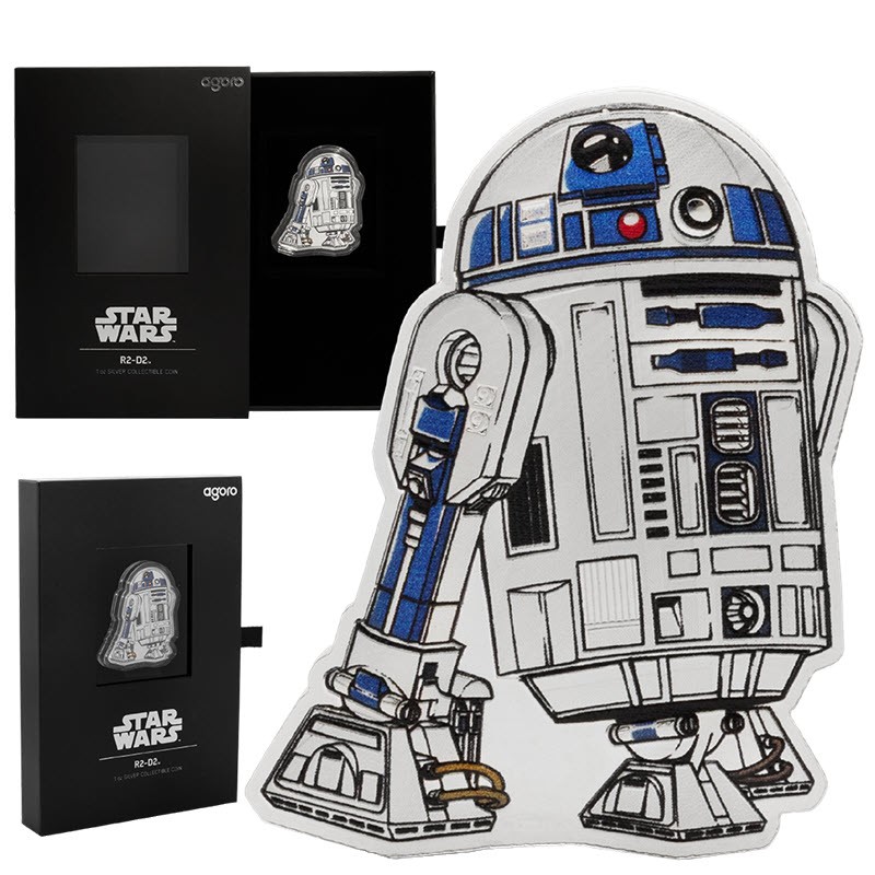 Серебряная монета Ниуэ весом 1 унция от Монетного двора Новой Зеландии посвящена дроиду R2-D2. У нее размеры 33 Х 44мм, качество пруф, селективная окраска и высокий рельеф. Поставляется в оригинальном футляре с сертификатом подлинности. Тираж: 2000 штук.