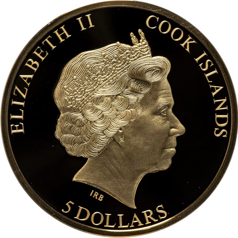 На аверсе монеты изображен профиль Ее Величества королевы Великобритании Елизаветы II дизайнера Яна Рэнк-Бродли (IRB). Вверху вдоль канта надписи: ELIZABETH II COOK ISLANDS (Елизавета II, страна-эмитент) Внизу: 5 DOLLARS (номинал).