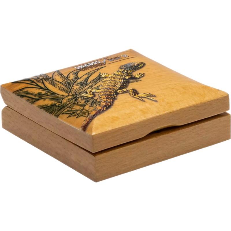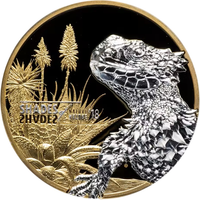 На реверсе – детальное изображение ящерицы на фоне характерной для неё среды обитания – Южно-Африканской степи. Слева в центре название серии – SHADES OF NATURE ’18 (Оттенки природы ’18) с зеркальным отражением. Фон монеты позолочен.