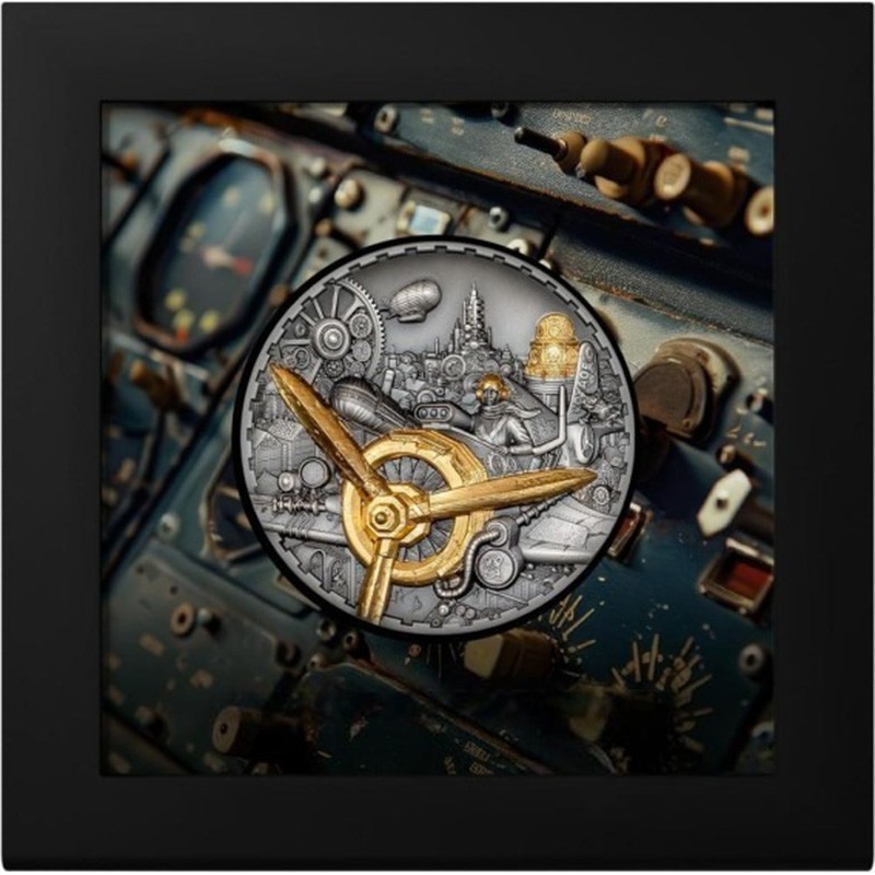 На реверсе детально изображен моноплан с открытой кабиной и пилотом, окруженный элементами индустриального пейзажа: шестеренками, зданиями в стиле стимпанк и дирижаблями в небе. Слева, около лопасти пропеллера год чеканки — 2025.