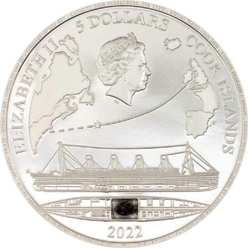 На аверсе, кроме портрета королевы Елизаветы II, изображен маршрут через Атлантику, включая точку в которой произошла катастрофа. Снизу две проекции корабля и внутренней части Титаника, в одном из отсеков кусочек угля. Надписи ELIZABETH II — имя королевы; COOK ISLAND — название страны-эмитента; 5 DOLLARS — номинал; 2022 — год выпуска.
