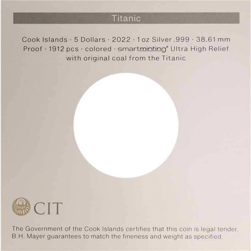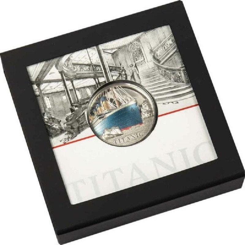 Серебряная монета Островов Кука, посвященная трагической истории самого известного лайнера и его кораблекрушению. Монета выполнена в качестве «Ultra High Relief Colored Silver Proof», поставляется в футляре с сертификатом подлинности.  Ограниченный тираж — 1912 штук (год катастрофы).