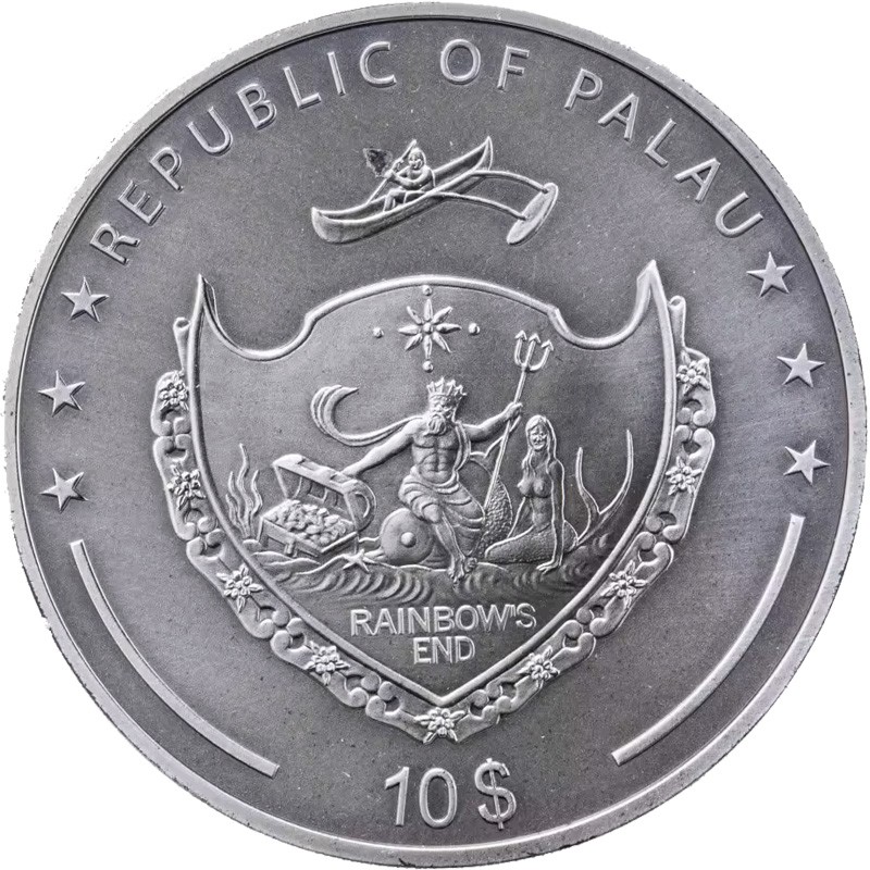 Вверху полукругом надпись: ***REPUBLIC OF PALAU *** (страна-эмитент). Внизу: 10$ (номинал).
