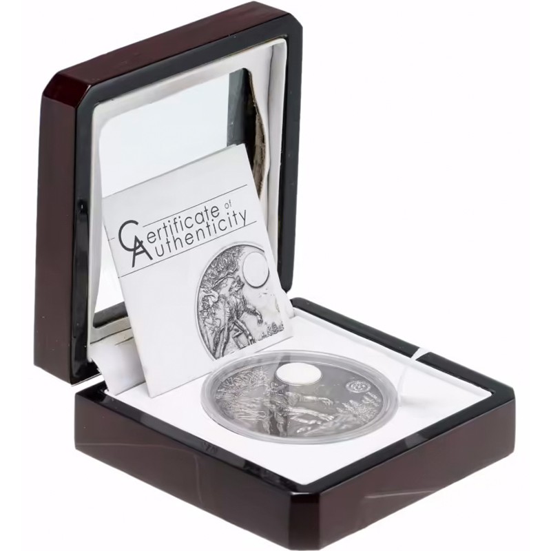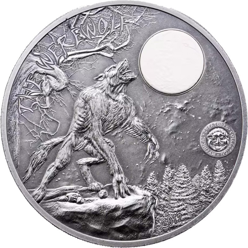 Эта удивительная 2 унцовая серебряная монета – первая из серии «Мифические существа» (Mythical Creatures), посвящена оборотню.