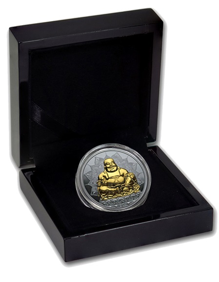 Золотой смеющийся Будда, окруженный цветочным узором.