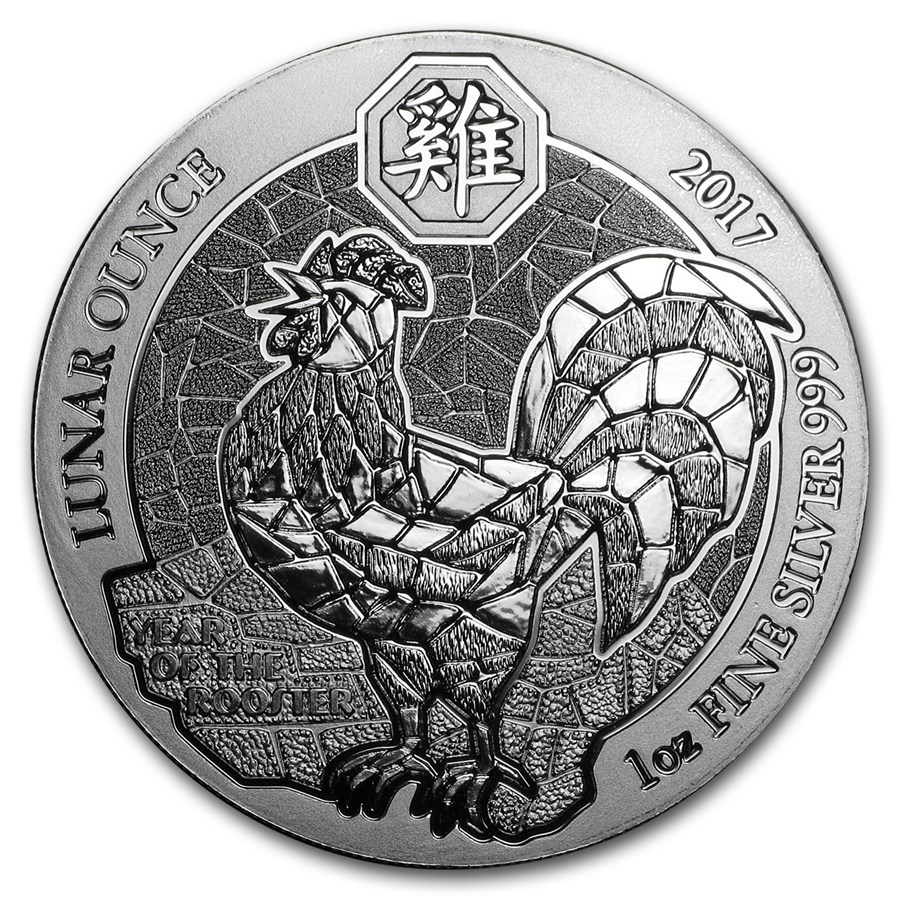 На реверсе находится стилизованное изображение петуха. Над ним китайский иероглиф, обозначающий «петух». Слева снизу от петуха находится надпись в три строки: «YEAR OF THE ROOSTER» (Год петуха). По ободу кругом находятся следующие надписи: «LUNAR OUNCE 1 oz FINE SILVER 999 2017» (Лунар 1 унция чистого серебра 0.999 пробы 2017 года).
