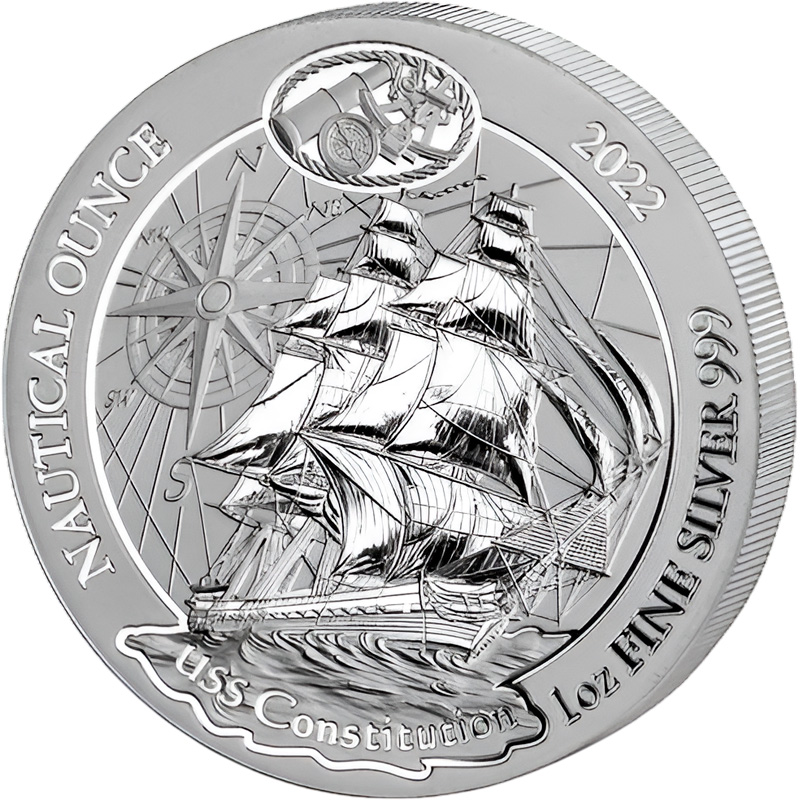 На реверсе изображен фрегат «Конституция» под парусами на фоне стилизованной морской карты и компаса. По ободу полукругом надписи: NAUTICAL OUNCE 2022 1 oz FINE SILVER 999 USS Constitution (серия, год чеканки, вес и проба серебра, название корабля). По центру над кораблем изображены различные морские инструменты.
