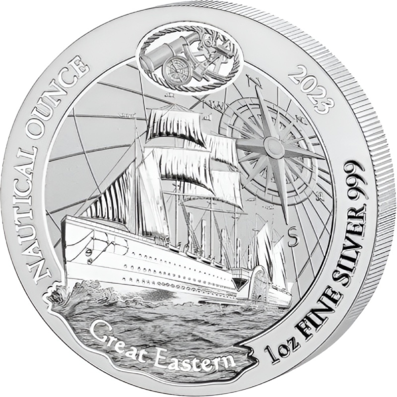На реверсе изображен пароход «Грейт-Истерн» под парусами на фоне стилизованной морской карты и компаса. По ободу полукругом надписи: NAUTICAL OUNCE Great Eastern 1 oz FINE SILVER 999 2023 (серия, корабль, вес и проба серебра, год чеканки). По центру над кораблем изображены различные морские инструменты.