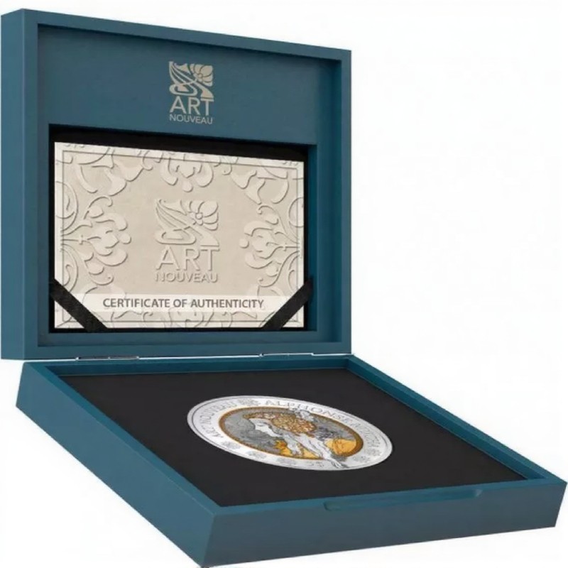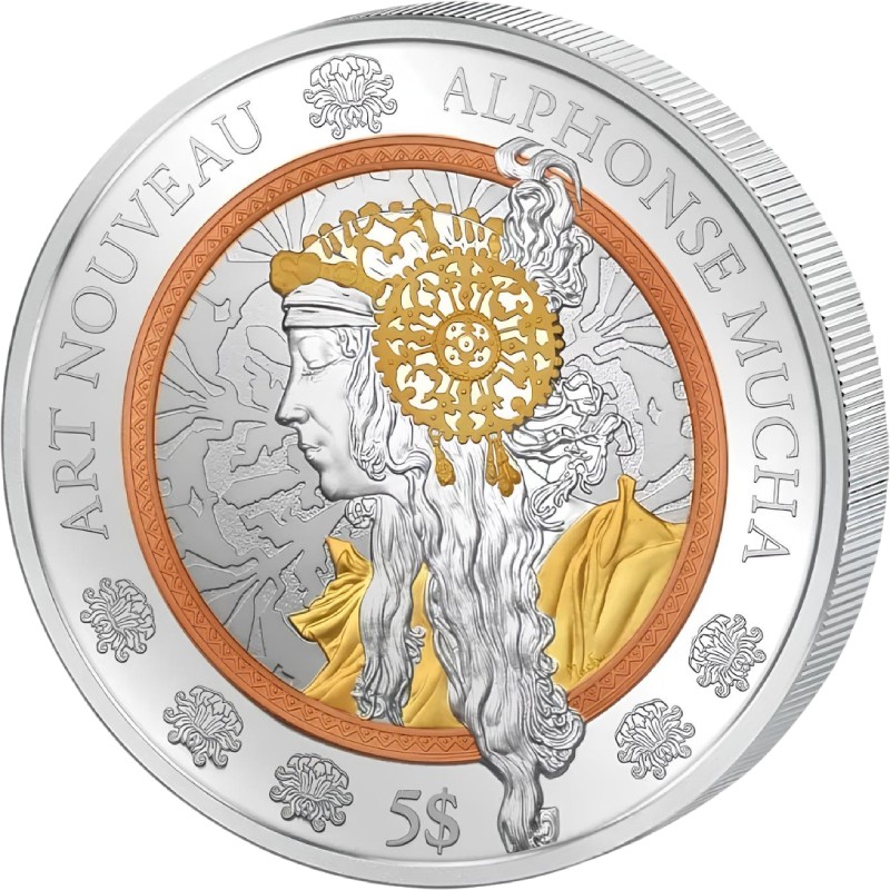 Эта чудесная 2 унцовая серебряная монета открывает новую серию монет «Арт Нуво». Она посвящена творчеству великого мастера стиля модерн - Альфонсу Мухи. Арт Нуво — уникальное явление в искусстве конца XIX века, объединившее архитектуру, живопись, графический дизайн и декоративные элементы, создав своеобразный гармоничный синтез искусств.