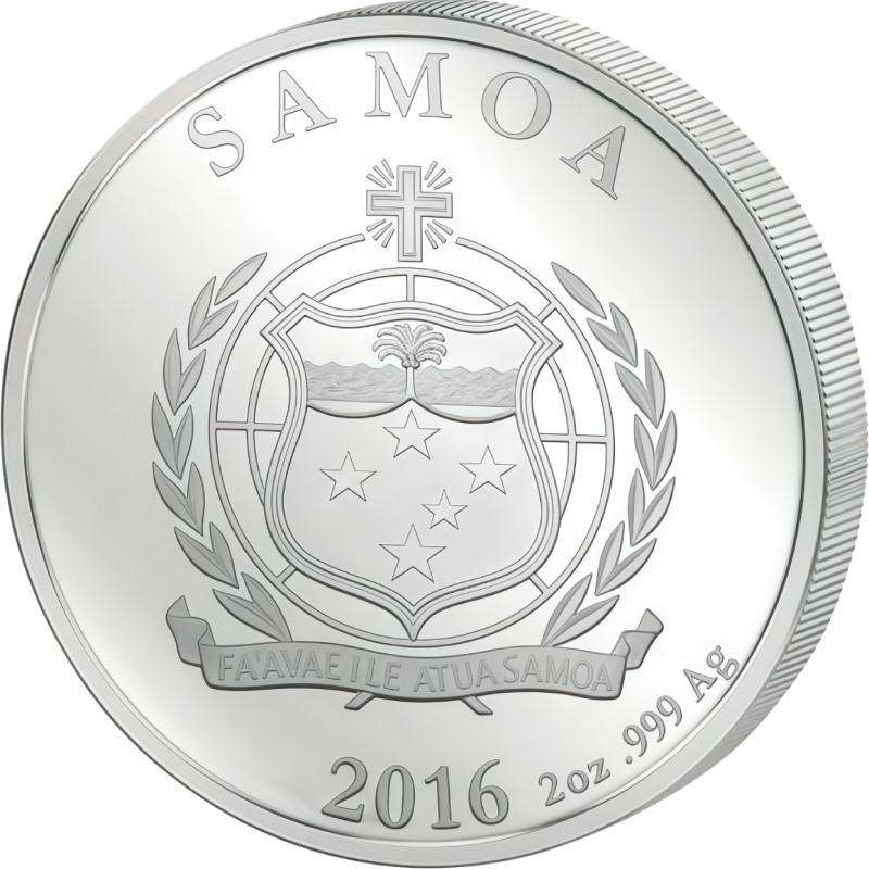В центре изображен герб Самоа. Под ним на ленте надписи FA'AVAE I LE ATUA SAMOA (Бог – основа Самоа). Вверху вдоль канта название страны-эмитента - SAMOA, внизу - год чеканки - 2016, вес и проба серебра – 2 oz .999 Ag.