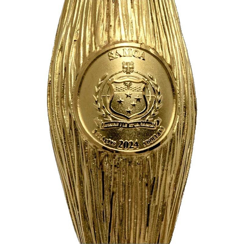 На аверсе изображен герб Самоа. Над гербом надпись: SAMOA (страна-эмитент), внизу: 3 oz Ag 999 2024 5 DOLLARS (вес и проба серебра, год чеканки, номинал).