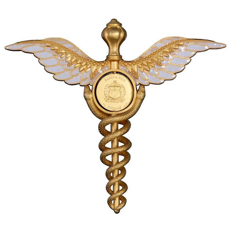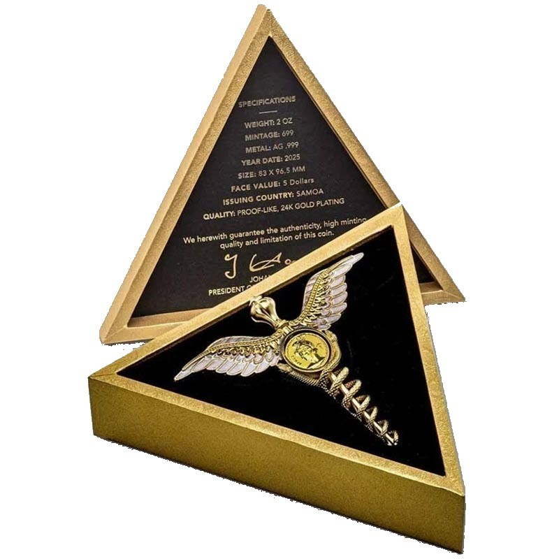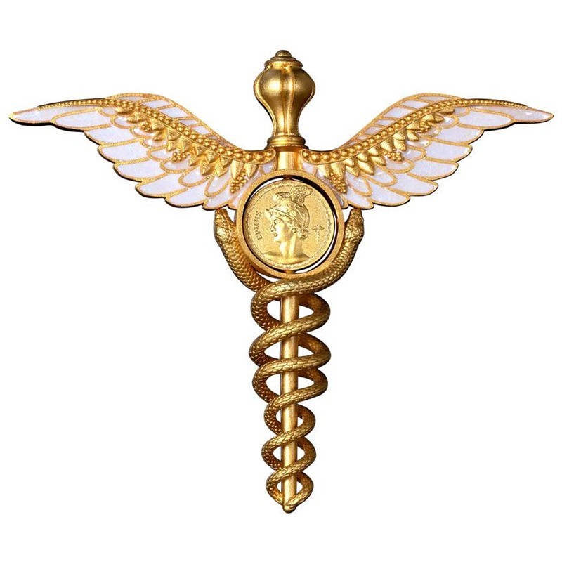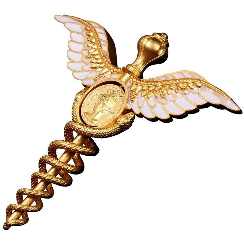 Эта потрясающая серебряная монета посвящена посоху Гермеса - кадуцею. У нее размеры 82 х 96,5 мм, качество пруф-лайк, белая эмаль и выборочное золочение в 24К. Центральная круглая монета вращается на 360 градусов. Поставляется в оригинальном футляре с сертификатом подлинности. Тираж: 699 штук.