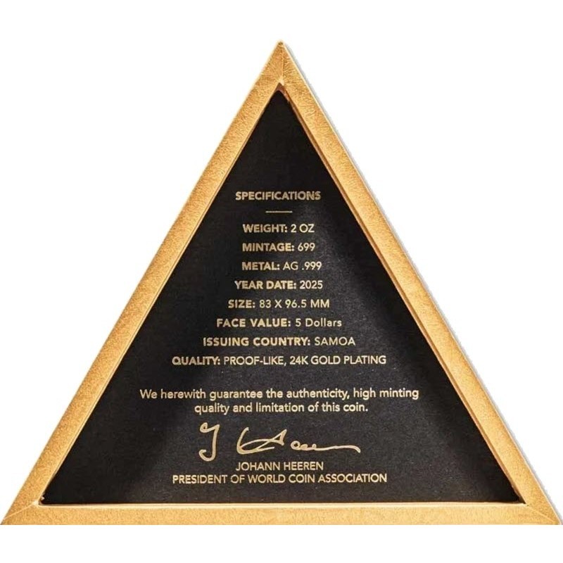 На аверсе монеты изображен герб Самоа. Вокруг герба надпись: SAMOA 2025 2 oz 5 DOLLARS Ag 999 (страна-эмитент, год чеканки, вес и проба серебра, номинал).