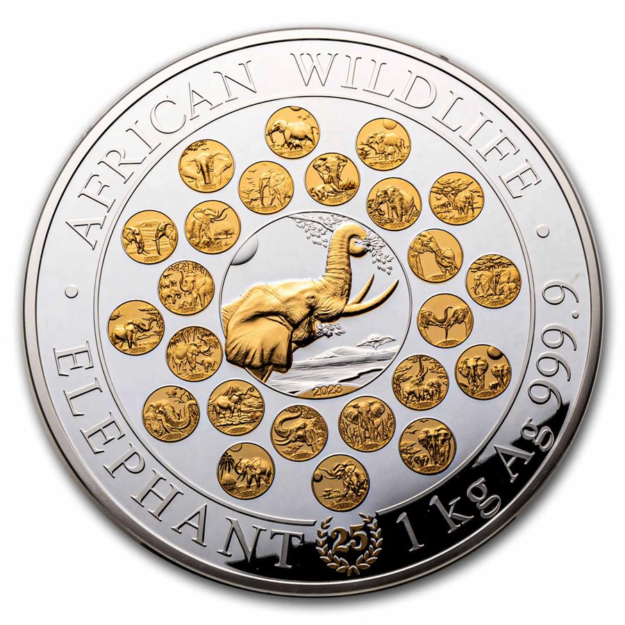 Серебряная монета Сомали "Слон. 25 лет выпуска" 2023 г.в.(пруф), 1000 г чистого серебра (Проба 9999)