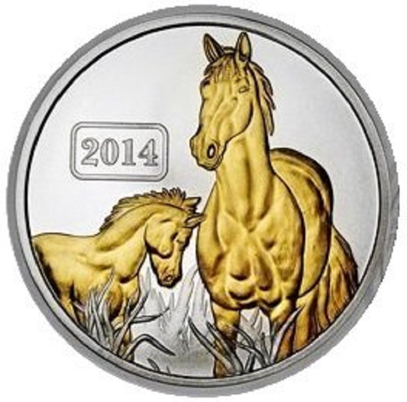 На реверсе изображены позолоченные лошадь с жеребенком в высокой траве и год «2014» в рамочке.