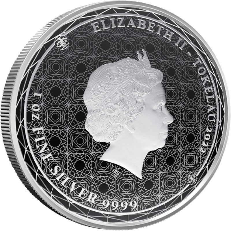 В центре на фоне волнообразных линий изображен портрет Её Величества Королевы Елизаветы II дизайнера Яна Рэнка-Бродли (IRB). Вверху справа вдоль канта надпись: ELIZABETH II – TOKELAU 2022 (Елизавета II, страна-эмитент, год чеканки), внизу слева: 1 oz FINE SILVER 9999 (вес и проба серебра). Фон монеты украшен сложным геометрическим узором из пересекающихся линий и кругов, создающий уникальный визуальный эффект.