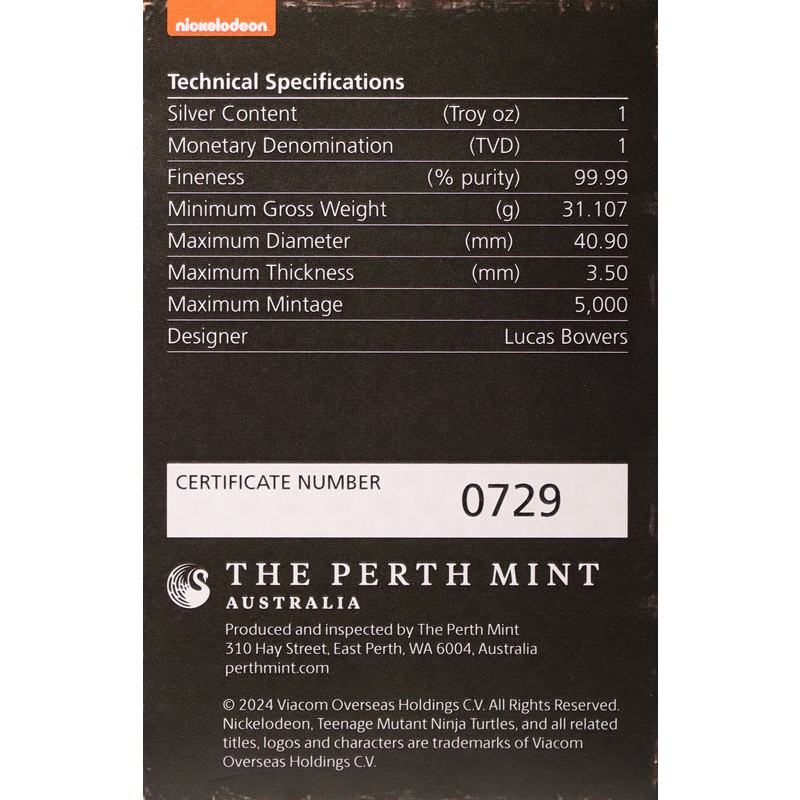 На реверсе изображен Микеланджело в боевом снаряжении с двумя нунчаками. Справа монограмма Пертского монетного двора Р, у колена инициалы дизайнера LB (Lucas Bowers). Слева надпись: MICHELANGELO, внизу вдоль канта: © 2024 Viacom Overseas Holding C.V. (авторские права).