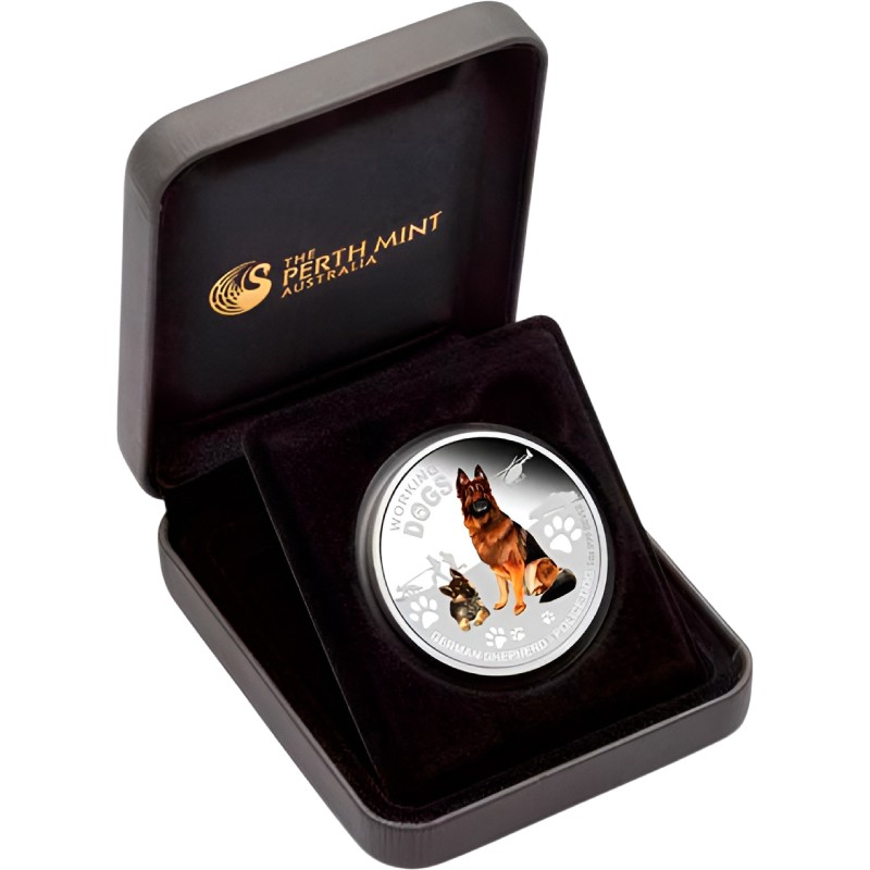 Эта чудесная серебряная монета Пертского монетного двора Австралии посвящена верному помощнику человека – немецкой овчарке.