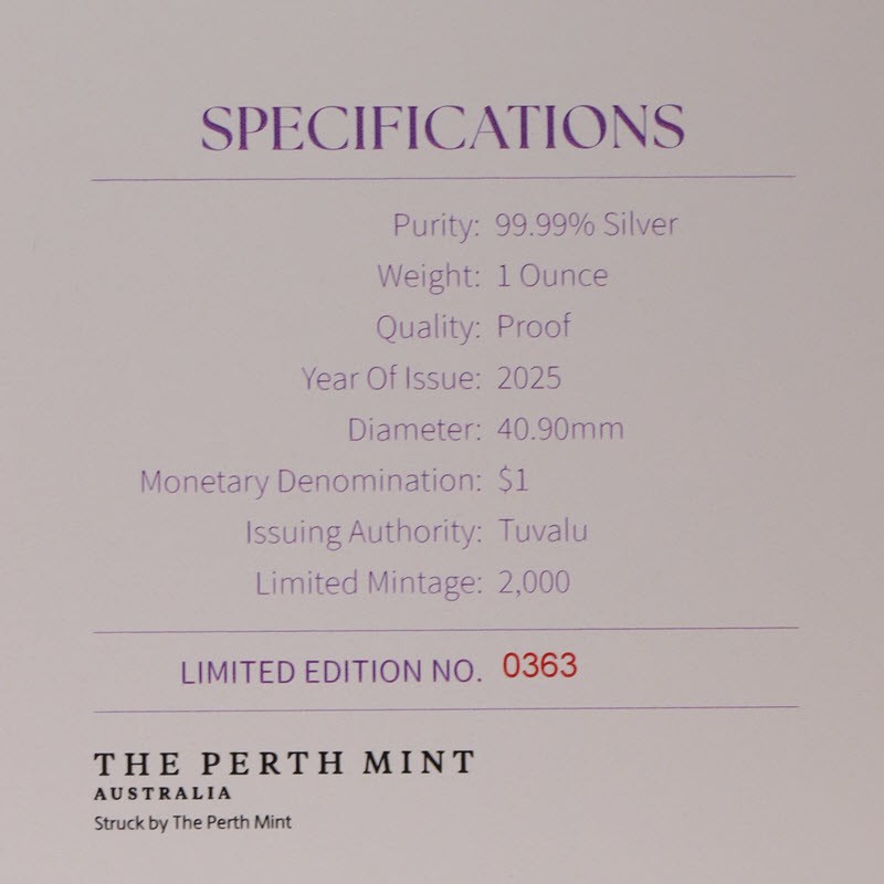 На аверсе изображен Его Величество король Чарльз III. На усечении шеи инициалы дизайнера JC (Jody Clark). Вдоль канта надпись: KING CHARLES III TUVALU · 1oz 9999 Ag 2025 1 DOLLAR · (Король Чарльз III, страна-эмитент, вес и проба серебра, год чеканки, номинал).