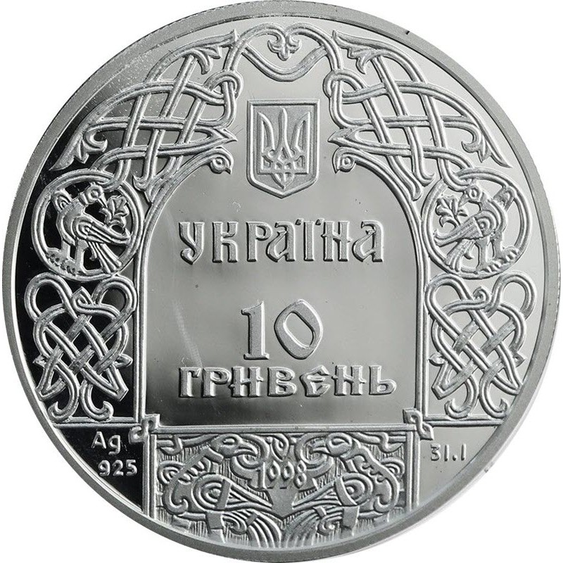 На аверсе изображен орнамент древнерусской напрестольной арки-оберега XII в. В центре малый герб Украины. Ниже надпись: УКРАЇНА 10 ГРИВЕНЬ 1998 Ag 925 31.1 (страна-эмитент, номинал, год чеканки, вес и проба серебра).