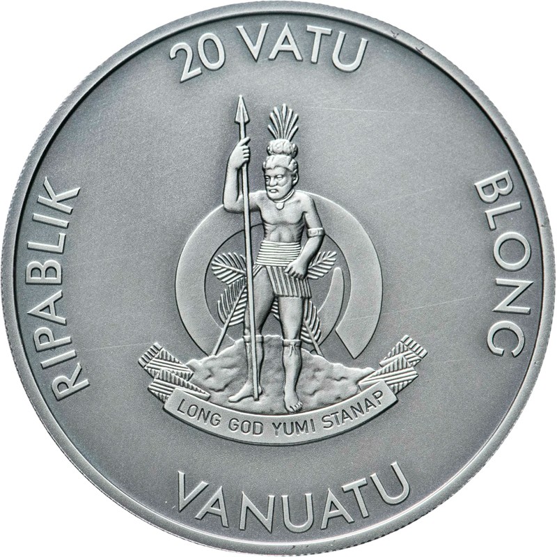 В центре изображен герб Вануату: меланезийский воин с копьем в руках, стоящий на фоне спиралевидного клыка. Позади воина расположены две ветви тропического папоротника «намеле». В нижней части герба - лента с девизом: LONG GOD YUMI STANAP (За Богом мы стоим). Вокруг герба надписи: RIPABLIK BLONG VANUATU 20 VATU (страна-эмитент, номинал).