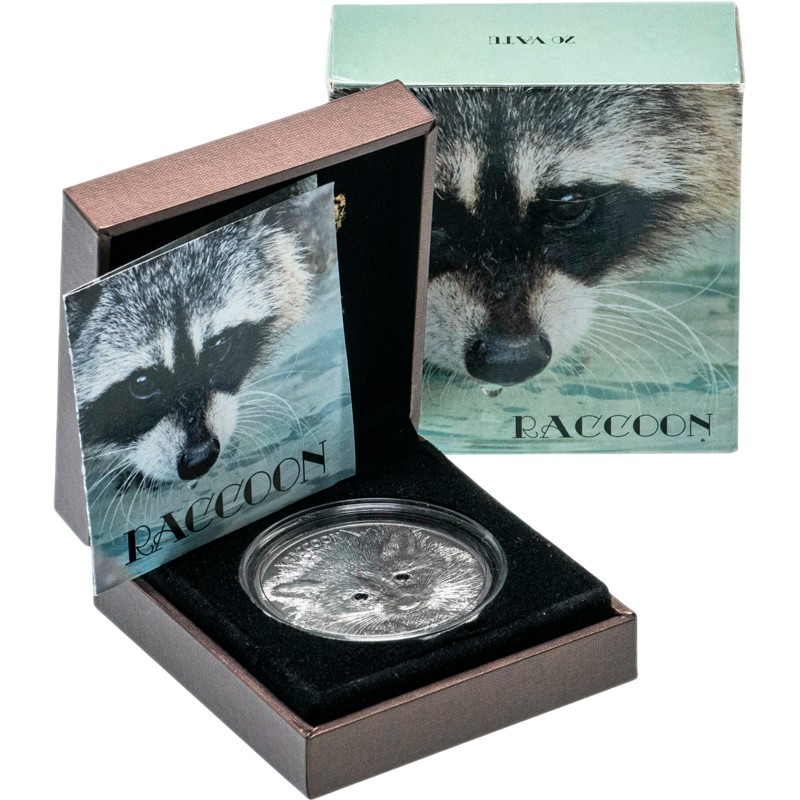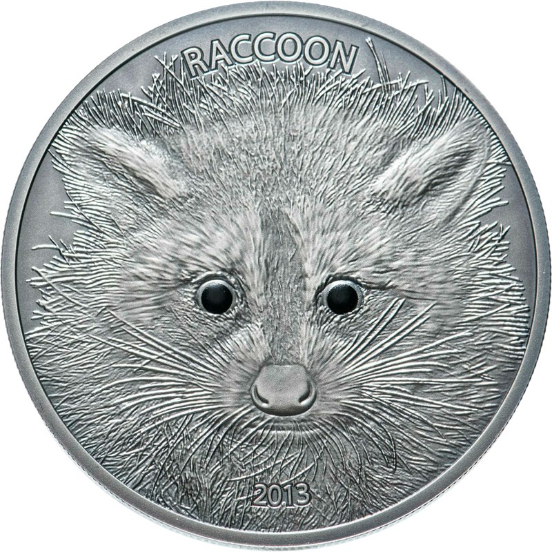 Эта замечательная серебряная монета весом 1 унция из серии «Лесные животные» (Forest Animals), посвящена еноту-полоскуну (Raccoon).