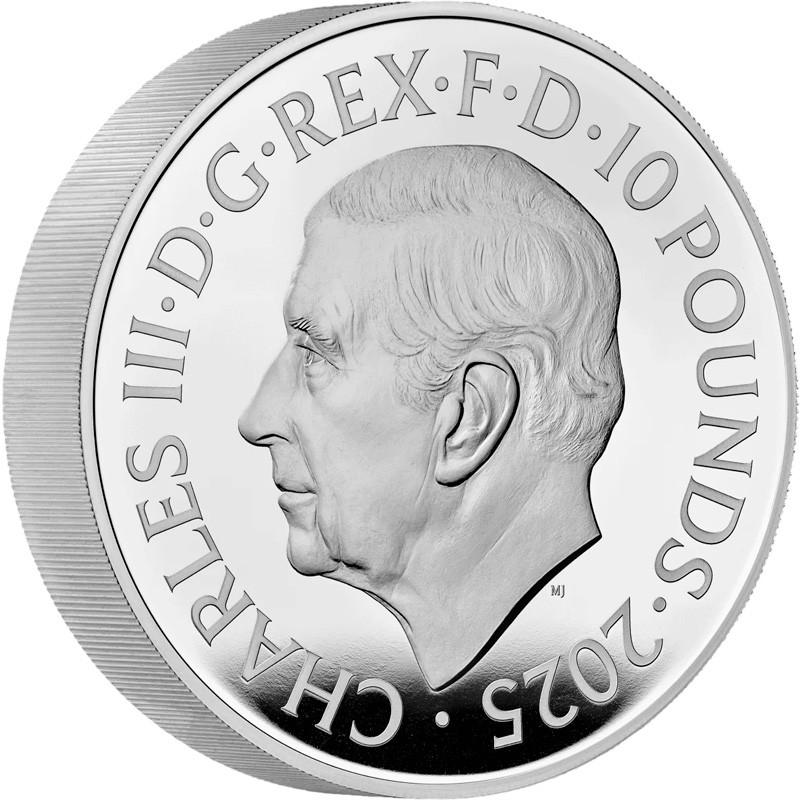 На аверсе изображен Его величество Король Чарльз III. Внизу портрета инициалы дизайнера MJ (Мартин Дженнинг). Вдоль канта надпись: CHARLES III·D·G·REX·F·D·10 POUNDS·2025 · (Чарльз III, божьей милостью, король, защитник веры, номинал, год чеканки).