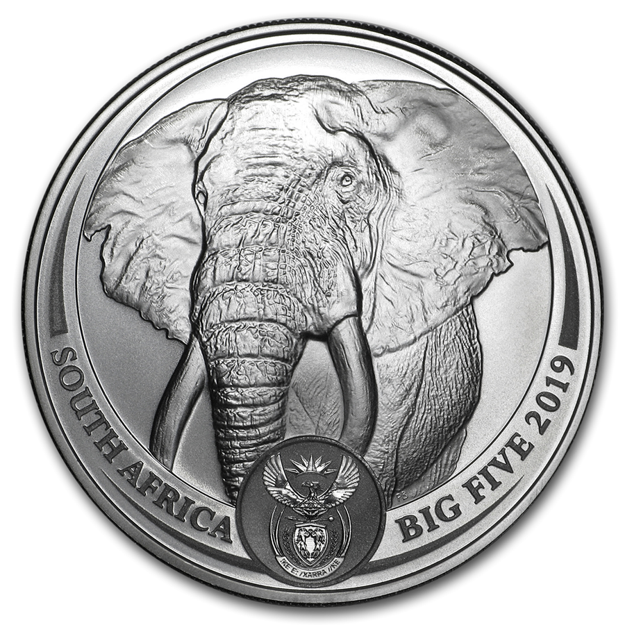 Крупное изображение слона, снизу герб ЮАР, название страны — "South Africa" и название серии — "Big Five 2019"