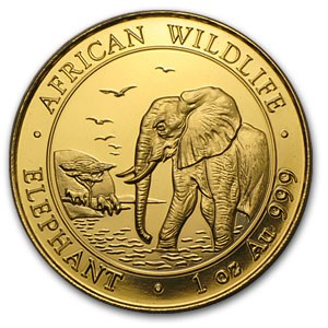 Золотая инвестиционная монета Сомали - Слон. Данная монета выпускается в рамках серии "Африканская дикая природа".
