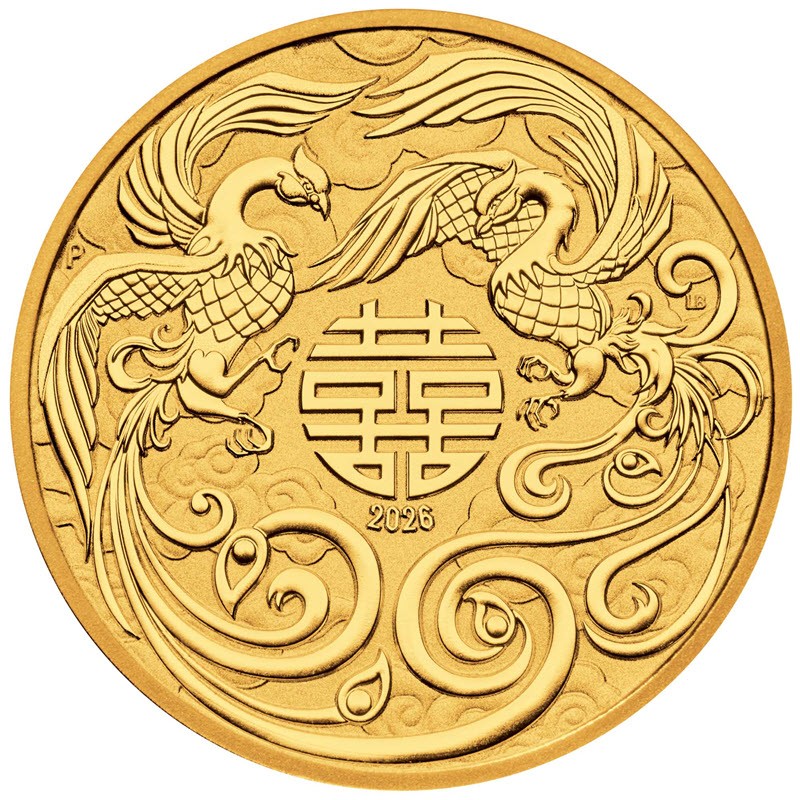 На реверсе в центре изображен символ двойного счастья: 囍, под ним: 2026 (год чеканки). Вокруг символа два влюбленных Феникса на фоне стилизованных облаков. Слева монограмма Пертского монетного двора Р, справа инициалы дизайнера: LB (Lucas Bowers).