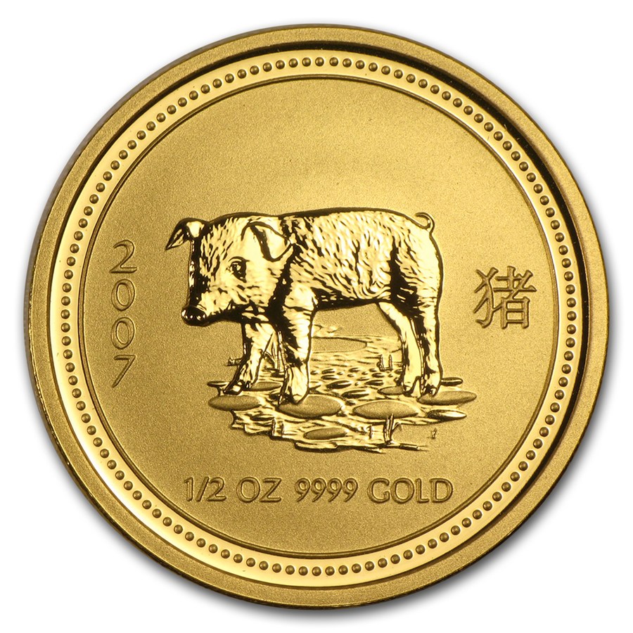 На реверсе изображен символ 2007 года - Свинья, китайский иероглиф, обозначающий соответствующее животное, слева год выпуска монеты, снизу - вес монеты (1/2 унции) и проба золота в монете (9999).
