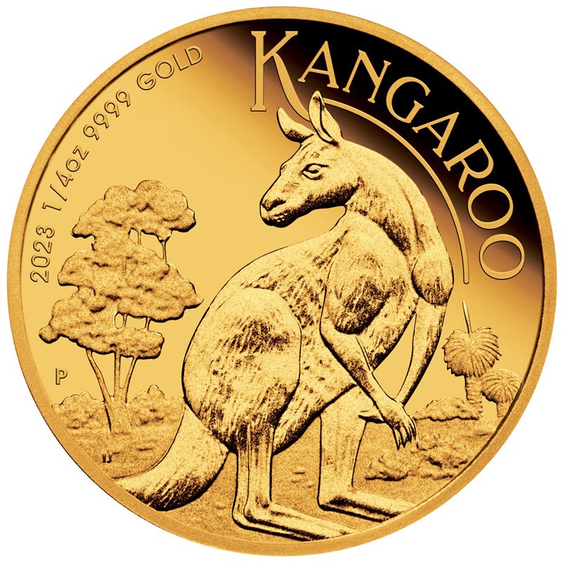 На реверсе изображен кенгуру, смотрящий через плечо, на фоне эвкалипта и пальм. Слева отметка Пертского монетного двора P. Под эвкалиптом инициалы дизайнера IJ ( Ing Ing Jong). Слева вверху: 2023 1/4 oz 9999 GOLD (год чеканки, вес и проба золота). Справа вверху надпись: KANGAROO.