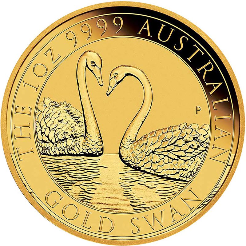 На реверсе изображены два лебедя, плывущие по воде. Инициалы дизайнера JM (Jennifer McKenna) на перьях лебедя слева, напротив буквы T, справа Р – монограмма пертского монетного двора. Вдоль канта надписи: THE 1oz 9999 AUSTRALIAN GOLD SWAN (вес и проба золота, лебедь).