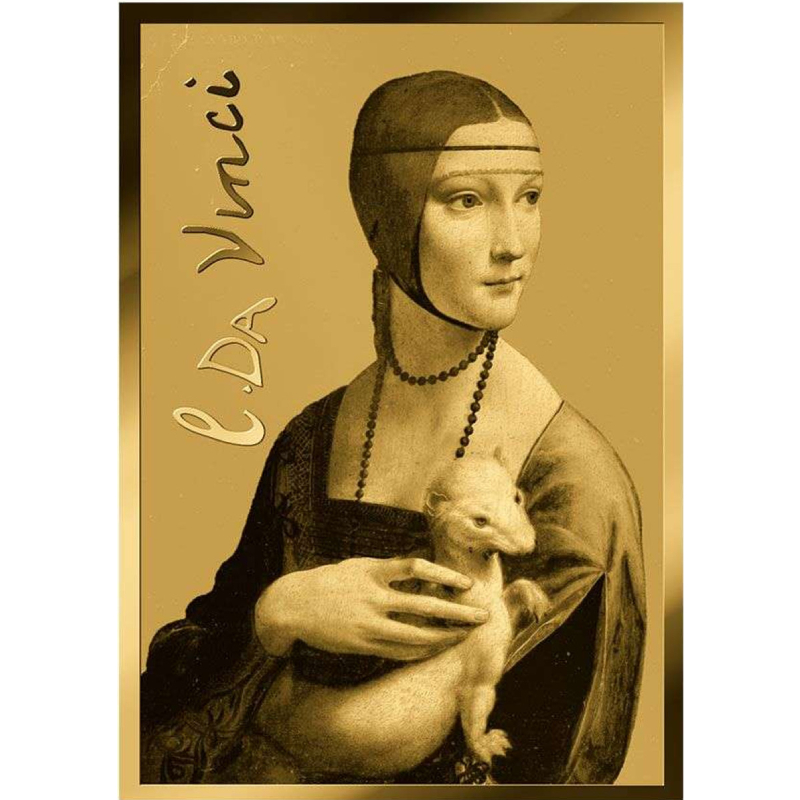 Эта потрясающая золотая монета весом 1/1000 унции посвящена картинам Леонардо да Винчи. У нее размеры 11 Х 15.4 мм и качество пруф-лайк. Поставляется в карточке с сертификатом подлинности. Тираж: 50 000 штук.