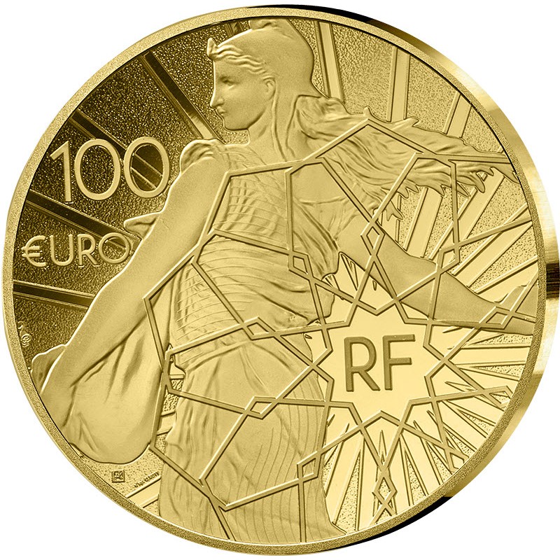 На аверсе изображена модернизированная версия Сеятельницы работы Луи-Оскара Роти (Louis-Oscar Roty), на драпировке её одеяния изображен геральдический вариант французского флага. Слева надпись: 100 €URO (номинал), справа: RF (страна-эмитент) окружена переплетающимися шестиугольниками.