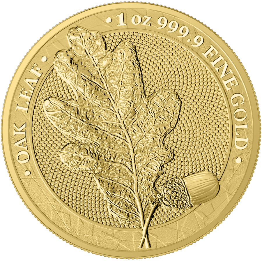 Изображение дубового листа с желудем. По ободу надписи: OAK LEAF - название; 1 oz 999.9 FINE GOLD - вес и чистота металла.
