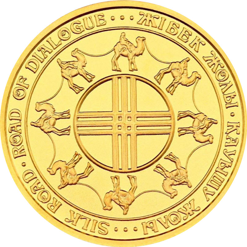 На оборотной стороне (реверсе) монет в центре стилизованное изображение шанырака - остова юрты, вокруг которого, в виде замкнутой цепочки располагается изображение торгового каравана верблюдов, олицетворяющее собой Шелковый Путь - символ сближения и связи стран, народов и цивилизаций. Вокруг изображения надпись на казахском и английском языках "ЖІБЕК ЖОЛЫ. ҚАУЫШУ ЖОЛЫ... SILK ROAD. ROAD OF DIALOGUE". Изображения и надписи на лицевых и оборотных сторонах монеты рельефные.