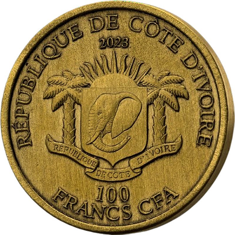На аверсе изображен герб Кот-д’Ивуара. Над гербом: 2023 (год чеканки). Вверху вдоль канта надпись: RÉPUBLIQUE DE CÔTE D'IVOIRE (страна-эмитент). Внизу надпись в две строки: 100  FRANCS CFA (номинал). На гурте порядковый номер монеты.
