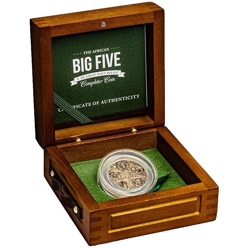 Дизайн этой золотой монеты из серии «Большая пятерка Африки» был реализован монетным двором П. де Грефа. У нее невероятный горельеф и античная отделка. Она завершает серию и содержит всех животных серии: лев, слон, леопард, носорог и буйвол. Поставляется в роскошном деревянном футляре с сертификатом подлинности. Тираж: 199 штук.