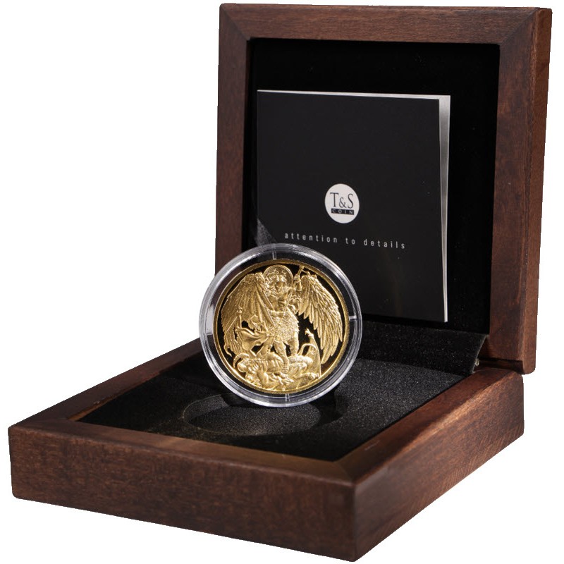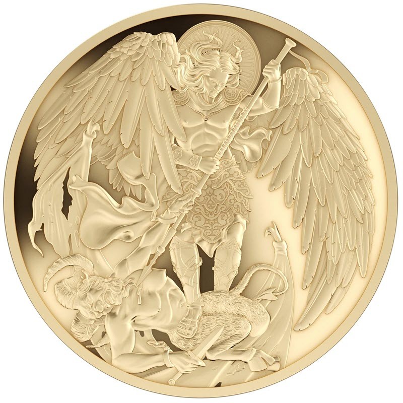 Эта чудесная золотая монета от литовского монетного двора T&S Coin посвящена Святому Архангелу Михаилу, владеющему мечом справедливости и праведности. У нее качество пруф. Поставляется в оригинальном футляре с сертификатом подлинности. Тираж: 50 штук.