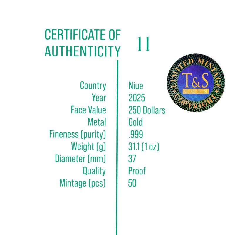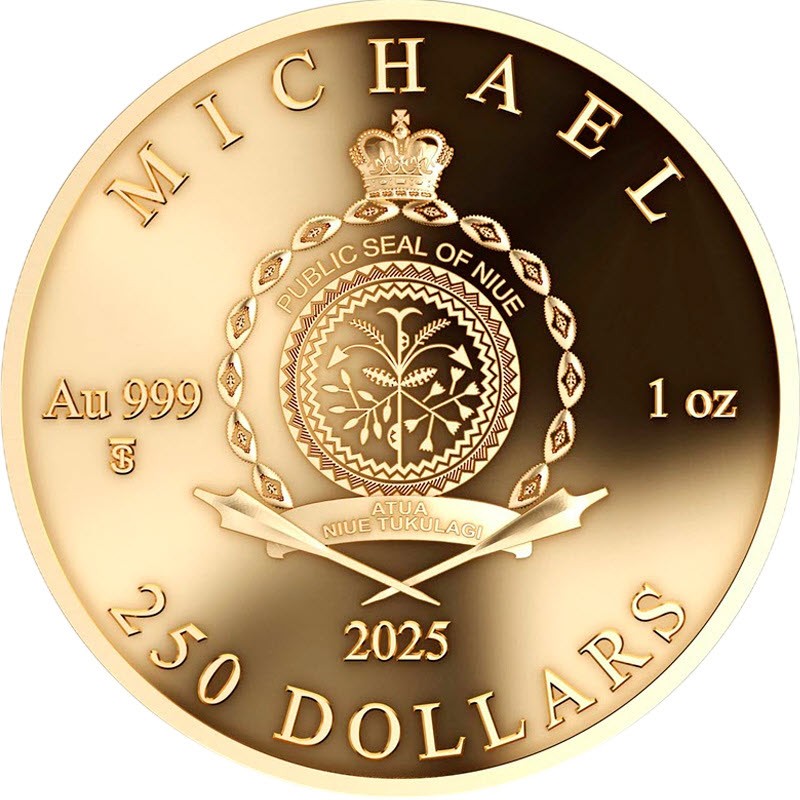 На аверсе монеты изображена неофициальная «Государственная печать Ниуэ». Это композиция из растений в центре внутри двойного декоративного круга, окруженного морскими раковинами. Он увенчан короной Святого Эдуарда (символом Соединенного Королевства, монарх которого в конечном итоге является главой государства Ниуэ). Сверху между ними надпись PUBLIC SEAL OF NIUE (ПУБЛИЧНАЯ ПЕЧАТЬ НИУЭ). Ниже на ленте в две строки изображен девиз ATUA NIUE TUKULAGI (Бог, Ниуэ навсегда), ниже которых две перекрещенные катуа. Вдоль канта надпись: MICHAEL Au 999 1 oz TS 2025 250 DOLLARS (название монеты, вес и проба золота, монограмма монетного двора, год чеканки, номинал).