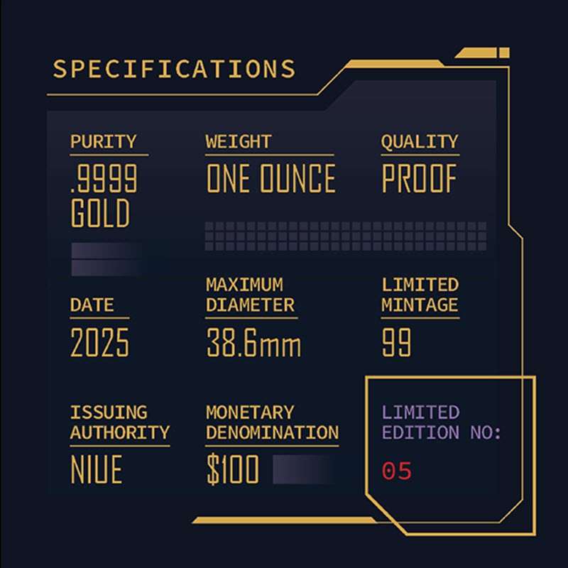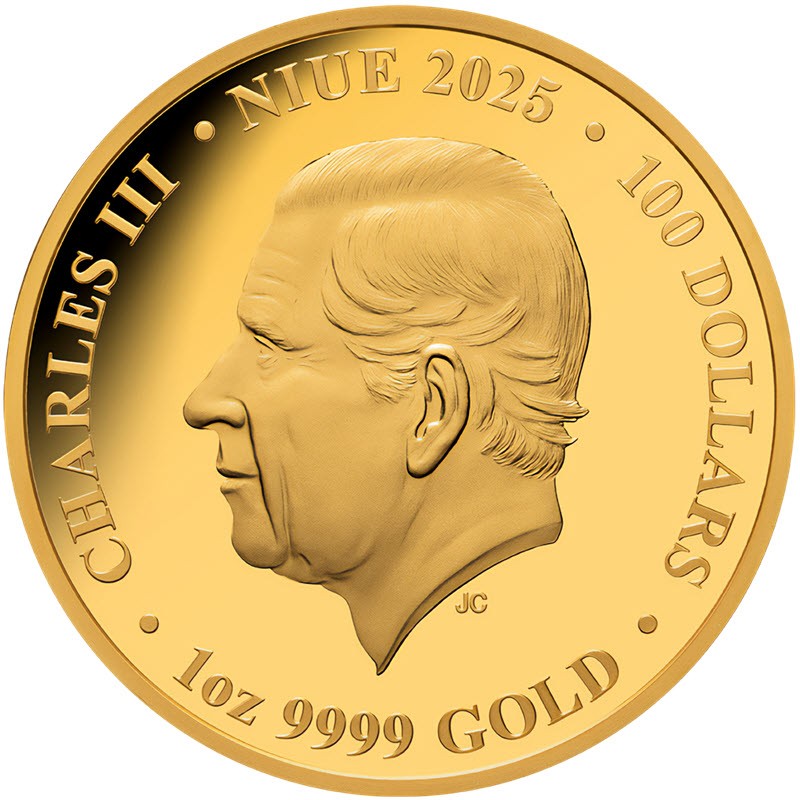 На аверсе изображен Его Величество король Чарльз III. На усечении шеи инициалы дизайнера Джоди Кларк (JC, Jody Clark). Вдоль канта надпись: CHARLES III · NIUE 2025 · 100 DOLLARS · 1oz 9999 GOLD · (Чарльз III, страна-эмитент, год чеканки, номинал, вес и проба золота).