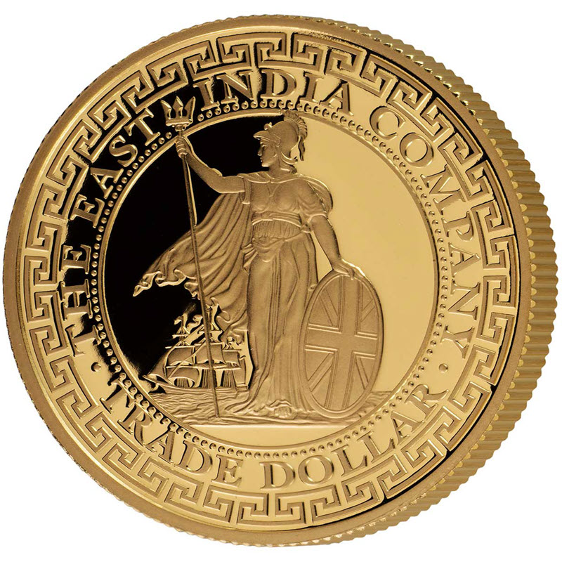 Золотая монета «Торговый доллар Британии» от Ост-Индской компании (EIC). У нее качество пруф и высокий рельеф. Поставляется в оригинальном футляре с сертификатом подлинности. Тираж: 200 штук.