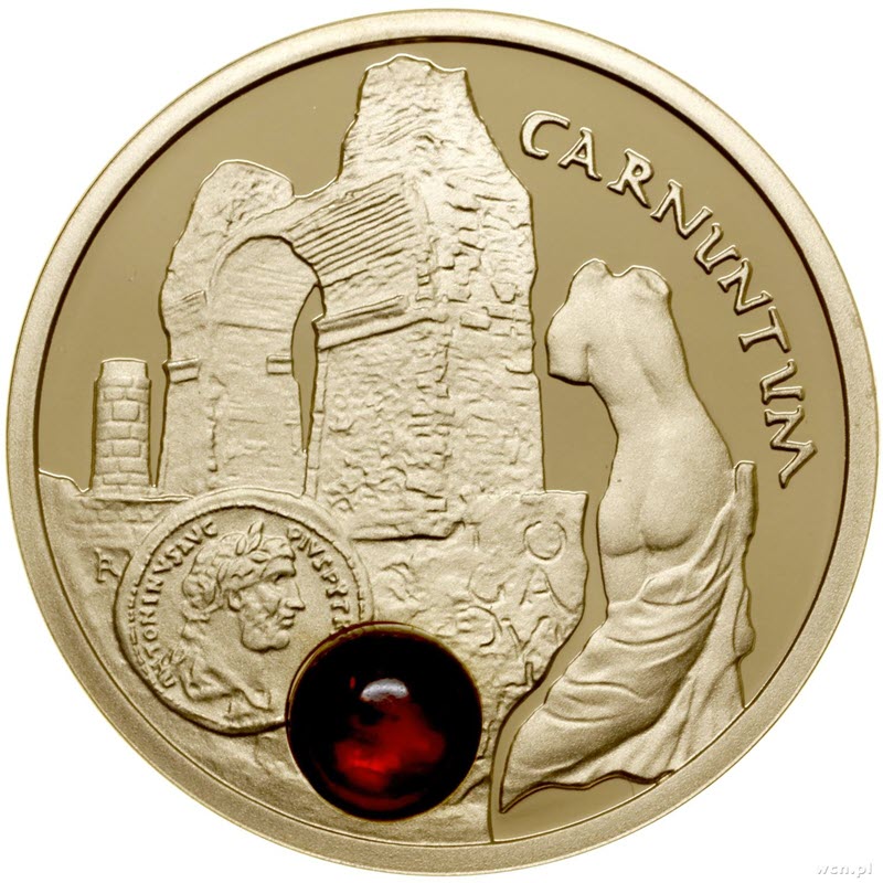 На реверсе слева изображение триумфальной арки Гейдентор, построенной во славу императора Константина II в IV веке. Под ней – изображение римской монеты эпохи Янтарного пути. Справа изображение скульптуры Венеры. Вверху справа надпись: CARNUNTUM, внизу вставка из янтаря.