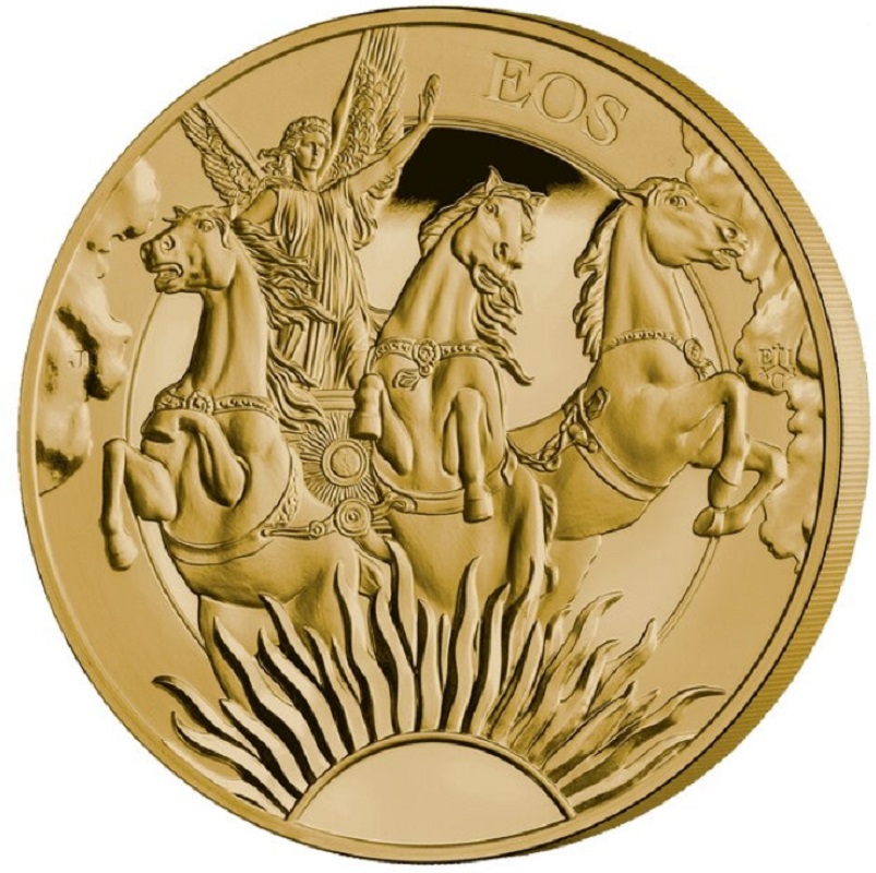На реверсе монеты изображена Эос, едущая над Солнцем на своей золотой колеснице, возвещающая теплое сияние нового дня, когда ее тянет по небесам ее великолепная упряжка лошадей, включая «Дневной свет» и «Огненный свет».