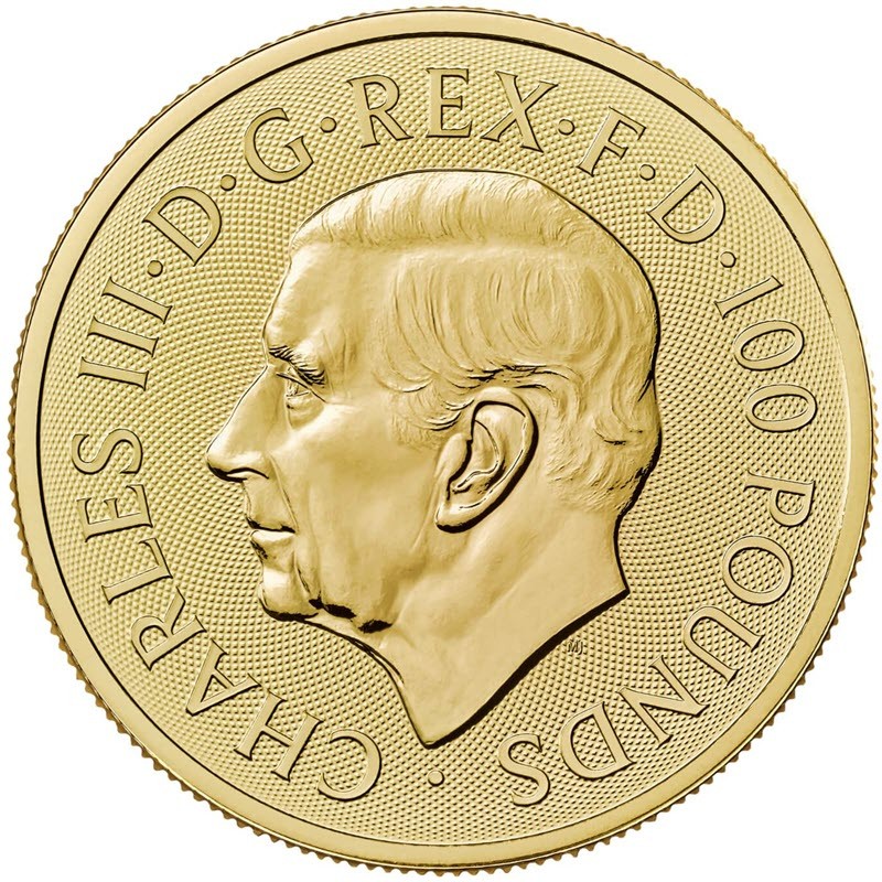 На аверсе изображен Его величество Король Чарльз III. Внизу портрета инициалы дизайнера MJ (Martin Jennings). Вокруг портрета надпись: CHARLES III · D · G · REG · F · D · 100 POUNDS · (Чарльз III, божьей милостью, король, защитник веры, номинал).