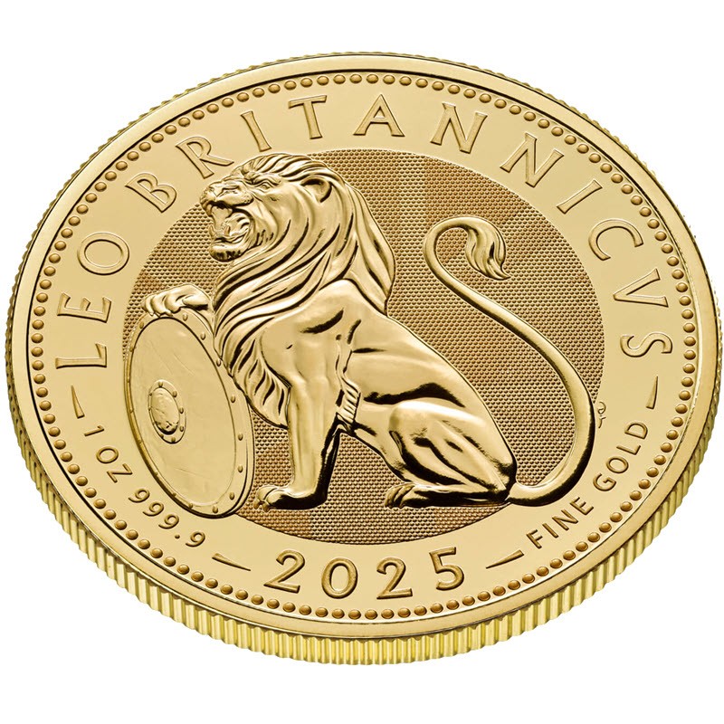 На реверсе изображен лев со щитом на фоне анимации флага Великобритании. Справа у хвоста инициалы дизайнера DL (David Lawrence). Вдоль канта надпись: LEO BRITANICVS 1 OZ 999.9 - 2025 - FINE GOLD (Британский лев, вес и проба золота, год чеканки).