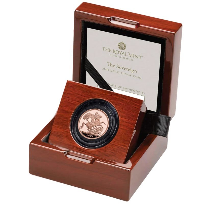На реверсе классическое изображение Святого Георгия и дракона от Бенедетто Пиструччи. Внизу справа инициалы дизайнера B.P. (Benedetto Pistrucci), ниже: 2024 (год чеканки).