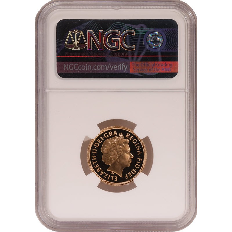 Золотая монета Великобритании "Соверен Елизавета II (1998-2015 - 4-й портрет)" 2000-2006 гг в слабе NGC PF70, 7.32 г чистого золота (проба 917)